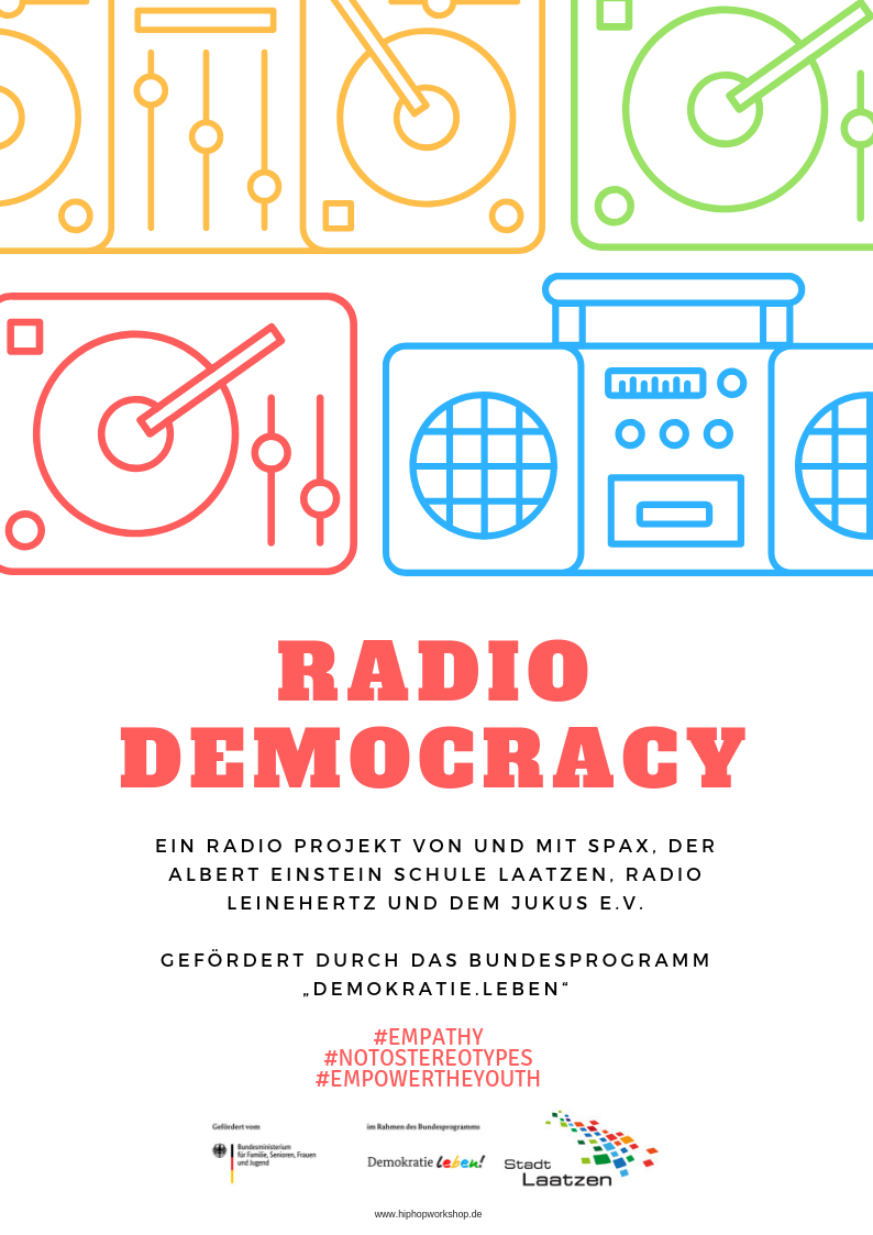 Im Rahmen des fünftägigen Workshops sollen sich die Schülerinnen und Schüler zunächst zum Thema „Demokratie“ austauschen und gemeinsam klären, wer welche Aufgaben im Rahmen des Workshops übernehmen kann. Danach soll eine Gruppe in die Textarbeit gehen und mit Hilfe von Textfragmenten und Überschriften einen Rap erstellen. Eine weitere Gruppe widmet sich parallel dem journalistischen Teil und macht Interviews mit Mitschülerinnen und Mitschülern und den Interviewgästen. Die Rap-Gruppe soll anhand des aufgenommenen Demos üben, wie z. B. Intonation und Ausdruck passend zum Song und zur Idee einzusetzen sind. Am letzten Tag wird der gemeinsame Song aufgenommen und zusammen mit den vorher entstandenen Bei-trägen zu einer Radio-Sendung bei Radio Leinehertz zusammengefügt und gesendet werden.